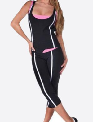 Enquiry for Private LabelThe soft and supple designer range of Navy Blue and Pink Yoga Set comes with a soft pink bra that fits well with its broad panels and support straps. The soft yet firm fit brought in with the bra is well complimented with the all black capris for perfect fit. The side pink and white print panel on sides add to significant designer appeal.